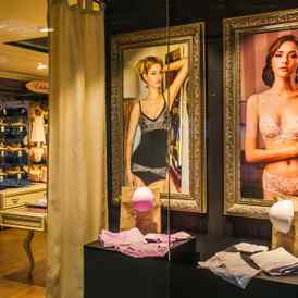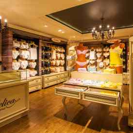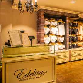В оформлении магазинов Edelica используются оригинальные обои, стилизованные под натуральное дерево. Интерьер нежный и элегантный. В залах классическая мебель в светлых оттенках и кованные люстры. Теплое освещение придает уюта и располагает к приятному шопингу.
